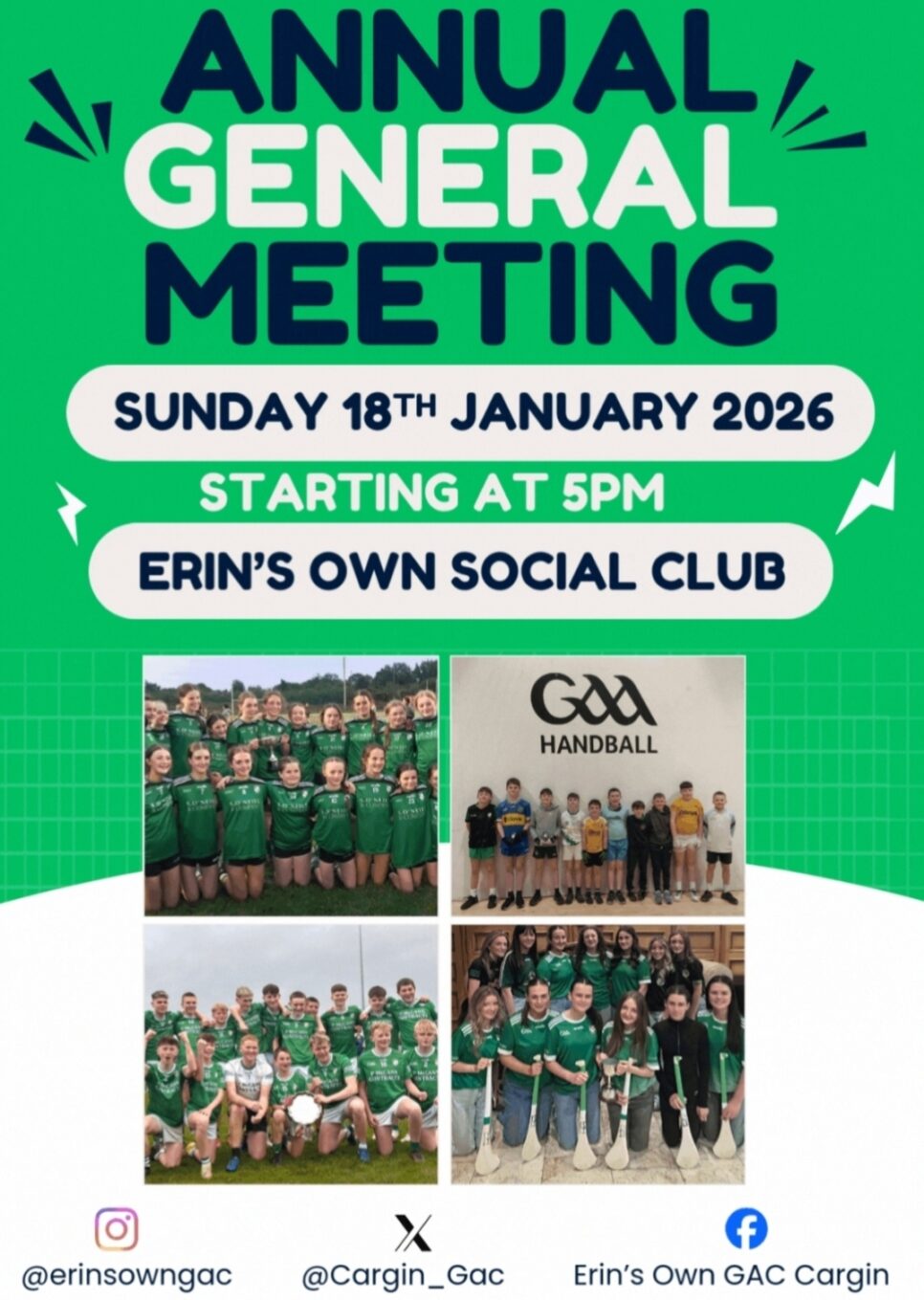 Erin's Own Cargin Annual General Meeting is on Sunday 18th January at 5pm in the social club. All members are invited to attend.